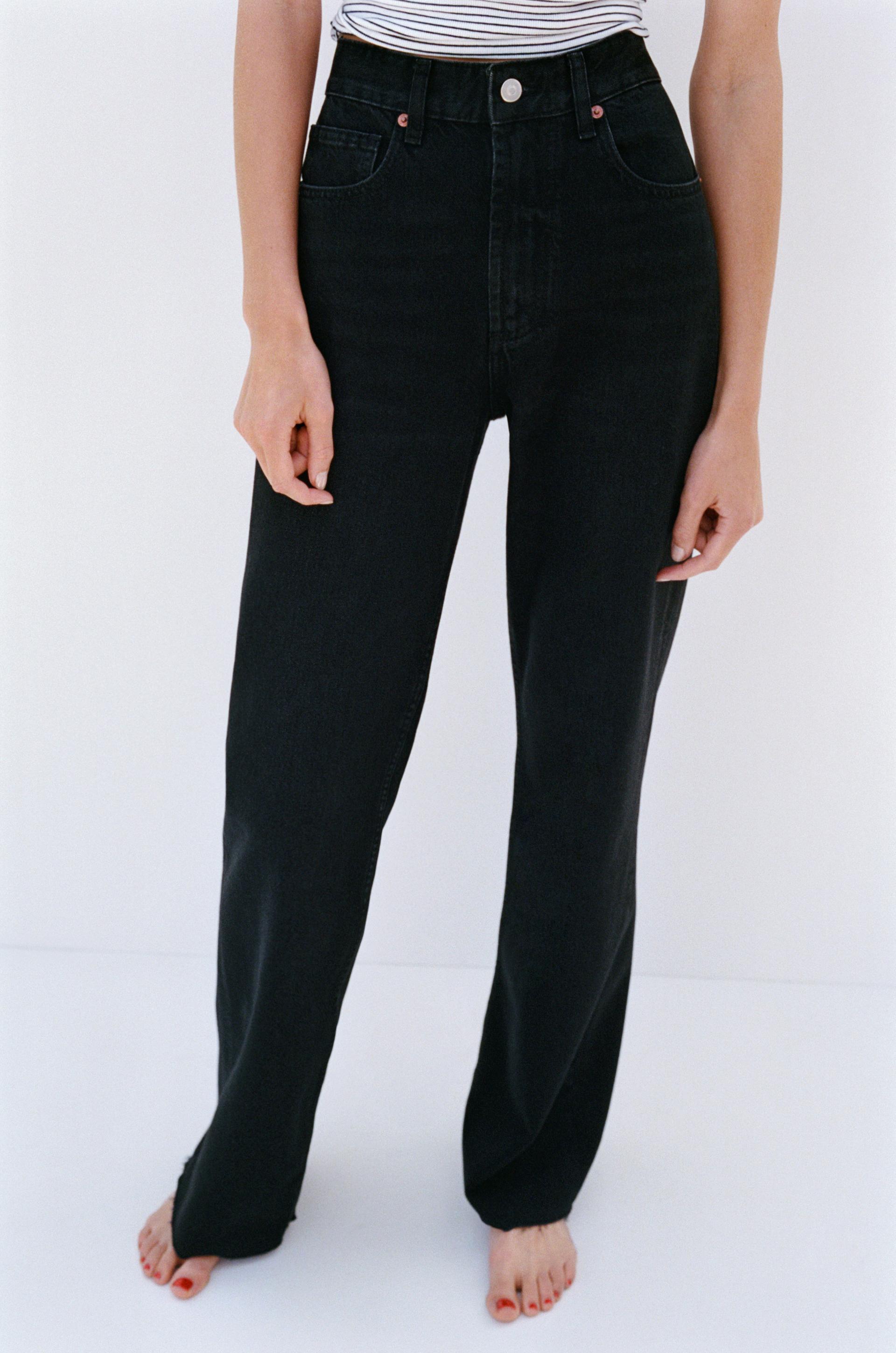 Calças de ganga de tecido rígido com cintura subida e cinco bolsos. Cintura com presilhas. Perna larga comprida. Fecho com fecho éclair e botão metálico.