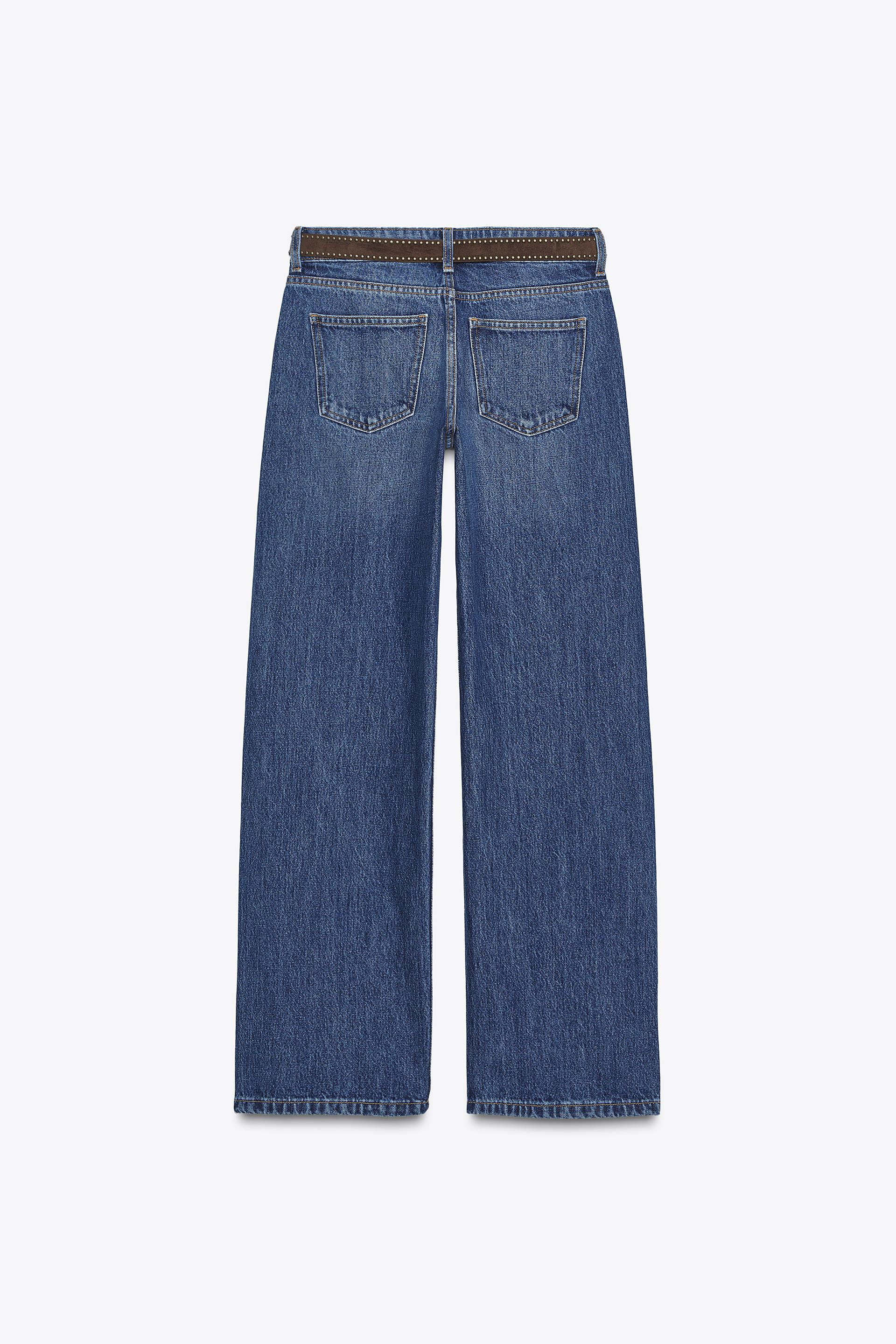 Jeans de cintura baixa com presilhas e cinco bolsos. Detalhe de cinto com fivela metálica. Perna reta e comprida. Fecho frontal com fecho de correr e botão.