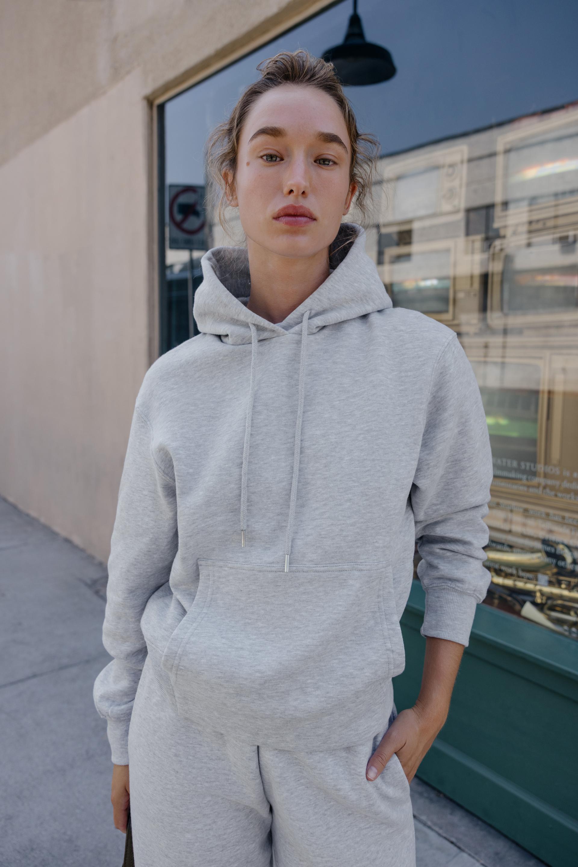 Sweatshirt de decote redondo com capuz e manga comprida. Bolso à frente tipo canguru. Acabamentos em nervuras.