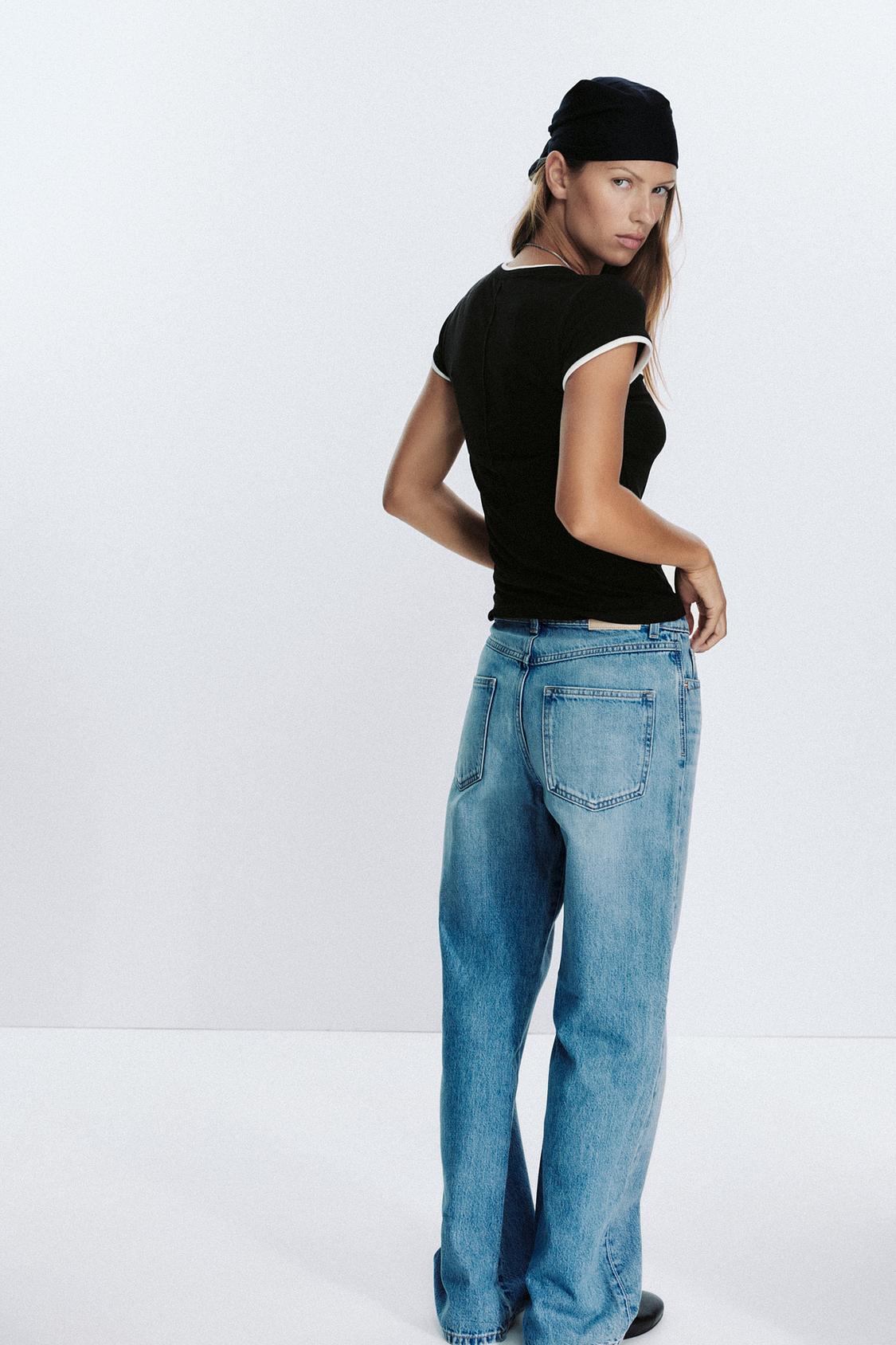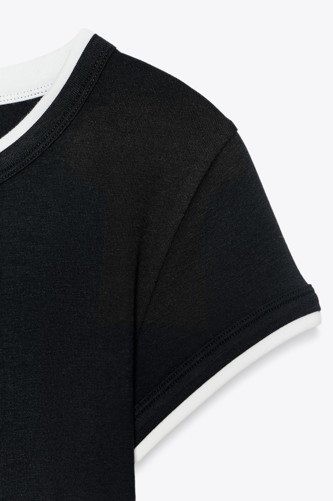 T-shirt confecionada com modal. Decote redondo e manga curta. Detalhe de acabamentos contrastantes com efeito duplo.