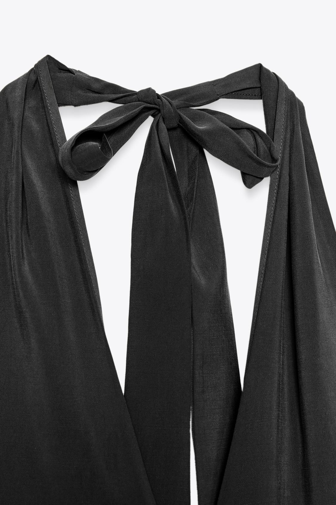 Vestido midi confecionado em tecido fluido. Gola halter com laçada e decote em bico. Costas descobertas.